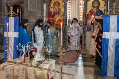 Στη συνέχεια έμπροσθεν του μνημείου του ηρωϊκού Επισκόπου Σαλώνων Ησαΐα, στον προαύλιο χώρο της Μονής, o Σεβασμιώτατος έψαλε τρισάγιο υπέρ αναπαύσεως των ψυχών των πεσόντων υπέρ πίστεως και πατρίδος κατά την επανάσταση του 1821, κατέθεσε στεφάνι και μαζί με τους ιερείς και τους ψάλτες έψαλε τον Εθνικό ύμνο.