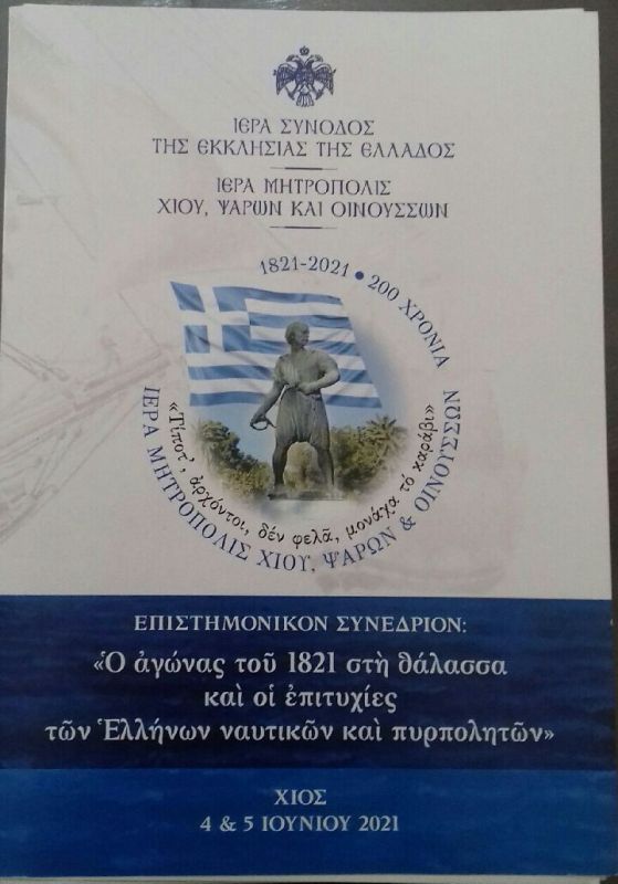 Ἡ Ἱερά Μητρόπολις Χίου, Ψαρῶν καί Οἰνουσσῶν μέ τά 46 ἑλληνικά νησιά καί βραχονησίδες της στά Ἀνατολικά σύνορα τῆς Ἑλληνικῆς Δημοκρατίας καί τῆς Εὐρωπαϊκῆς Ἑνώσεως διοργανώνει ὑπό τήν αἰγίδα τῆς Ἱερᾶς Συνόδου τῆς Ἐκκλησίας τῆς Ἑλλάδος, μέ τήν φροντίδα τῆς Εἰδικῆς Συνοδικῆς Ἐπιτροπῆς Πολιτιστικῆς Ταυτότητος, διήμερο διεθνές Ἐπιστημονικό Συνέδριο μέ θέμα: «Ὁ ἀγώνας τοῦ 1821 στὴ θάλασσα καὶ οἱ ἐπιτυχίες τῶν Ἑλλήνων ναυτικῶν καὶ πυρπολητῶν», ἔχοντας συνεργασθεῖ μέ τό Γενικόν Ἐπιτελεῖον Ναυτικοῦ (Γ.Ε.Ν.), τήν Ἐπιτροπή Ἐπετειακῶν Ἐκδηλώσεων Δήμου Χίου «ΧΙΟΣ 2021», τό Πανεπιστήμιο τοῦ Αἰγαίου καί κυρίως τό Διεθνές Κέντρο Ναυτικῆς Ἔρευνας καί Παράδοσης - Κοινωφελές Ἵδρυμα «ΜΑΡΙΑ ΤΣΑΚΟΣ», πού ἀνέλαβε ἐξ ὁλοκλήρου τήν τεχνική ὑποστήριξη τοῦ Συνεδρίου, πρός τούς ὁποίους ὀφείλω εὐγνωμοσύνη.