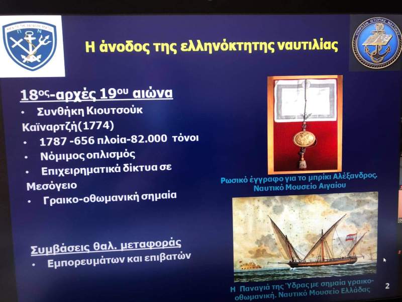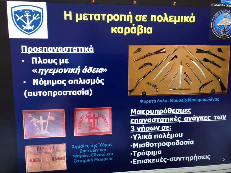 - κ. Μιχαήλ Κατσικαρέλη Σημαιοφόρου(ΠΝ) -Ὑπηρεσίας Ἱστορίας Ναυτικοῦ, μέ θέμα: «Ἡ μετατροπή τῶν ἑλληνόκτητων πλοίων σέ πολεμικά. Ὁ θεσμός τῆς Συντροφοναυτίας καί οἱ βασικοί τύποι πλοίων στήν Ἑλληνική Ἐπανάσταση».