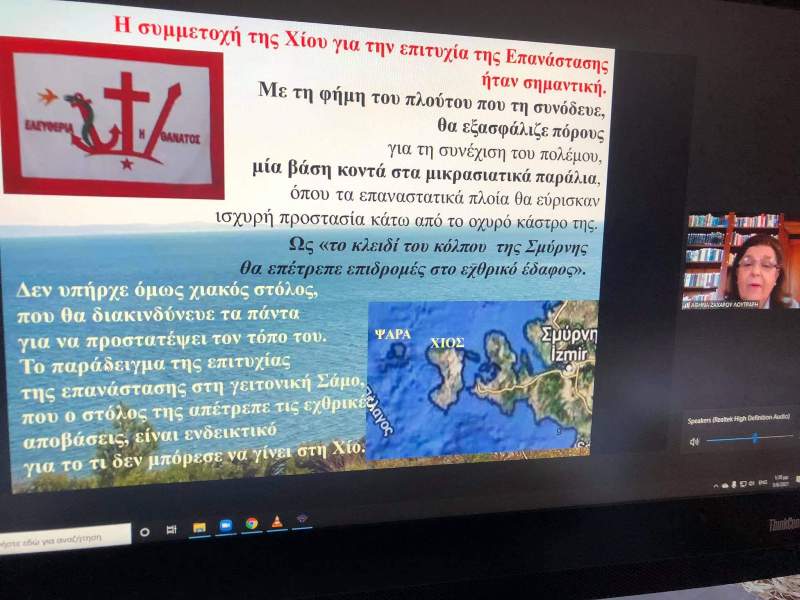 - Ἀθηνᾶς Ζαχαροῦ-Λουτράρη, Δρ Ἱστορίας, μέ θέμα: «Ὁ Ἑλληνικός καί ὁ τουρκικός στόλος στήν ἐπανάσταση καί καταστροφή τῆς Χίου».