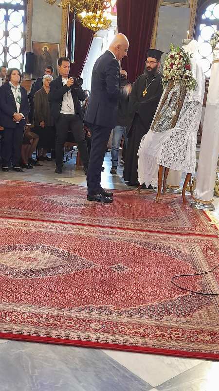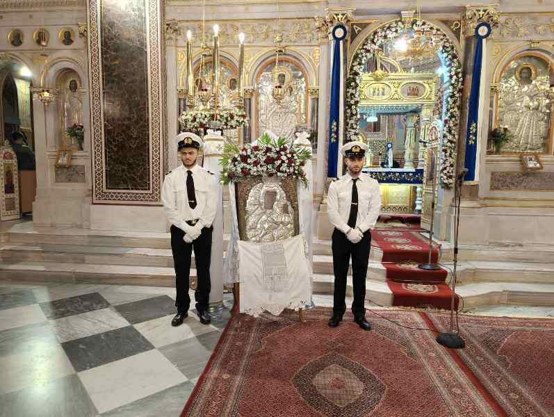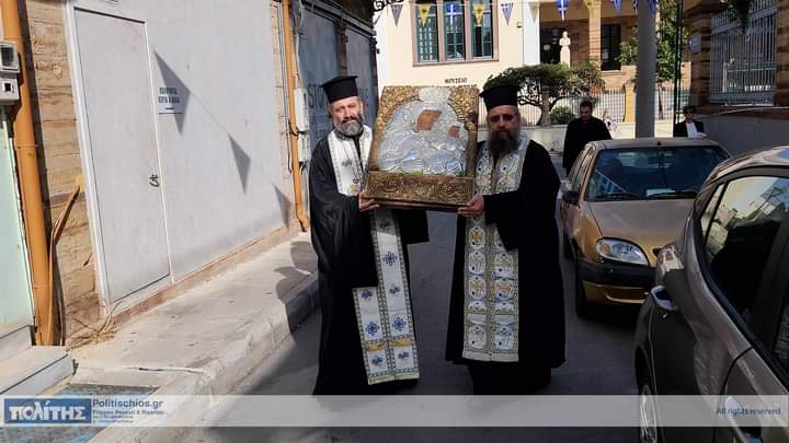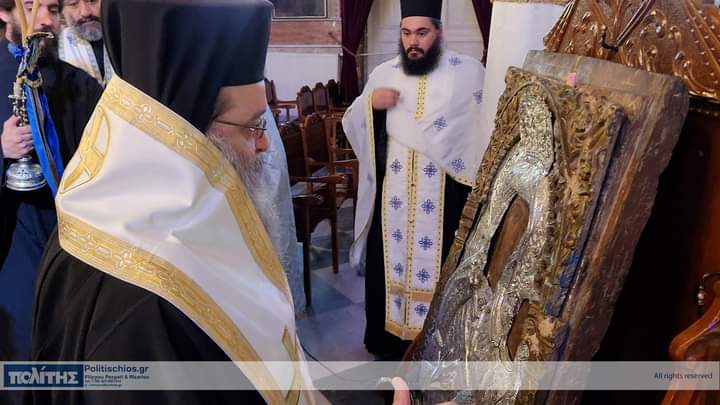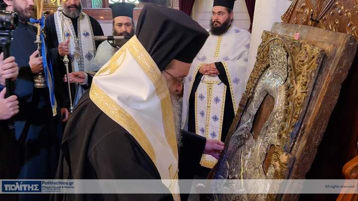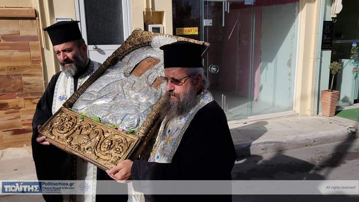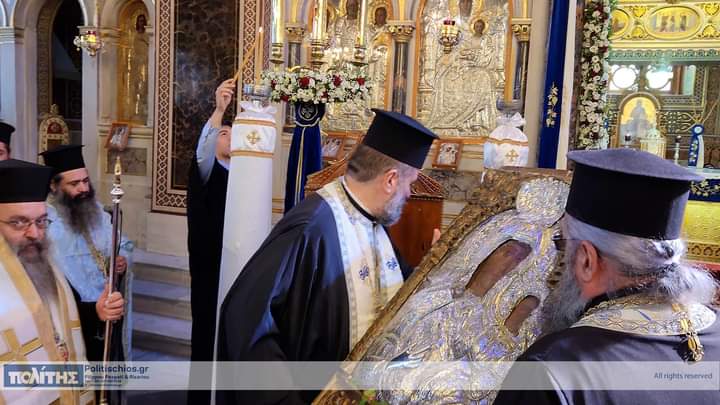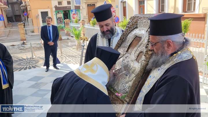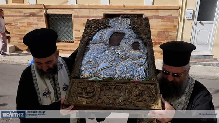 Ἡ Ἱερά Εἰκών μεταφέρθηκε τό πρωΐ τῆς 10ης Νοεμβρίου, στόν Ἱερό Μητροπολιτικό Ναό σύμφωνα μέ ἀπόφαση τοῦ Σεβ. Μητροπολίτου Χίου, Ψαρῶν καί Οἰνουσσῶν κ. Μάρκου ὅπως στόν ἑορτασμό τῆς ἱερᾶς Μνήμης τῶν Πολιούχων συμμετέχει καί ἱστορική εἰκόνα τῆς Παναγίας, μεταφερόμενη στόν Ἱερό Μητροπολιτικό Ναό ἀπό τόν Ἱερό Ναό ἤ τήν Ἱερά Μονή ὅπου φυλάσσεται. Ἡ ὑποδοχή τῆς Ἱερᾶς Εἰκόνος ἔγινε μέ ἐκκλησιαστική λαμπρότητα καί ἱεροπρέπεια προεξάρχοντος τοῦ Σεβ. Μητροπολίτου Χίου, Ψαρῶν καί Οἰνουσσῶν κ. Μάρκου πλαισιωμένου ὑπό Ἱερέων καί τοῦ Ἀρχιδιακόνου, τοῦ Βουλευτοῦ καί τ. Ὑπουργοῦ κ. Παναγιώτου Μηταράκη καί πλήθους πιστῶν. Ἀκολούθησε Δέησις Προεξάρχοντος τοῦ Σεβασμιωτάτου Μητροπολίτου Χίου κ. ΜΑΡΚΟΥ.