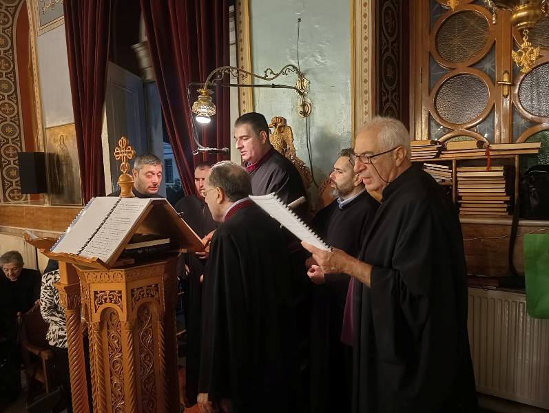 Στίς Ἱερές Ἀκολουθίες ἔψαλε ἡ Χορῳδία τοῦ Συλλόγου Ἱεροψαλτῶν Χίου "Ρωμανός ὁ Μελῳδός" σέ δύο Χορούς ὑπό τήν Διεύθυνση τοῦ Πρωτοψάλτου τῆς Ἱερᾶς Μητροπόλεως Χίου, Ψαρῶν καί Οἰνουσσῶν καί Χοράρχη τοῦ Συλλόγου κ. Βασιλείου Χαμέτη, ὡς καί τοῦ Λαμπαδαρίου τοῦ Ἱ. Μητροπολιτικοῦ Ναοῦ κ. Ἀντωνίου Κυδώνη.