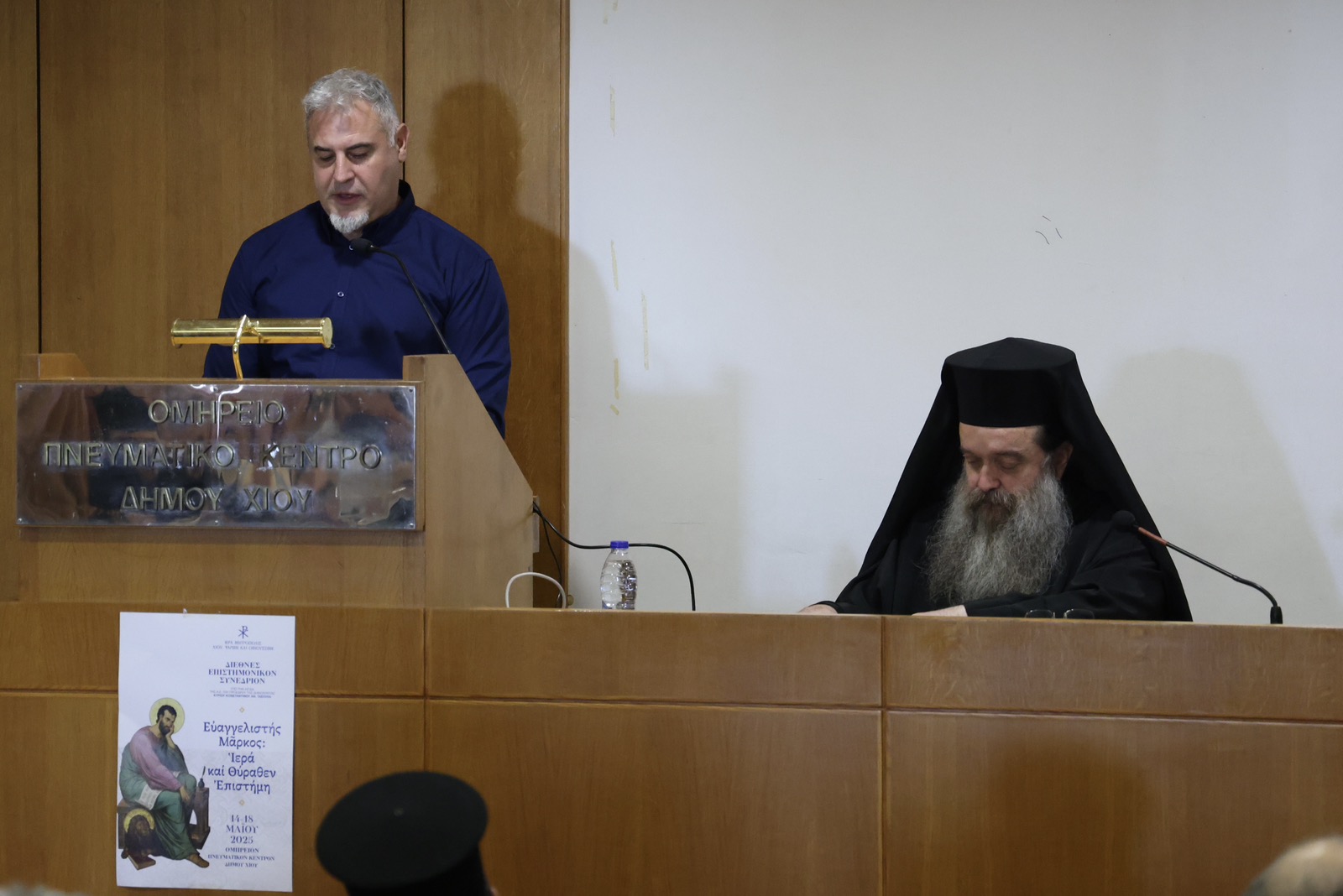 Εἰς τιμήν αὐτοῦ τοῦ θαυμασιωτάτου τῶν ἀποστόλων, ἱεροτελεστικωτάτου τῶν ἱεραρχῶν, στερροτάτου καί γενναιοτάτου τῶν ἀθληφόρων Εὐαγγελιστοῦ Μάρκου ἀπεφασίσαμεν τήν διοργάνωσιν Διεθνοῦς Ἐπιστημονικοῦ Συνεδρίου, θέμα ἔχοντος «Εὐαγγελιστής Μᾶρκος: Ἱερά καί Θύραθεν Ἐπιστήμη» εἰς τό ΟΜΗΡΕΙΟΝ ΠΝΕΥΜΑΤΙΚΟΝ ΚΕΝΤΡΟΝ ΧΙΟΥ ἀπό 14ης ἕως 18ης Μαΐου 2025 ὑπό τήν αἰγίδα τοῦ Ἐξοχωτάτου Κυρίου Προέδρου τῆς Δημοκρατίας ὥστε ὁ θεοκήρυξ καί πνευματοφόρος Εὐαγγελιστής νά ἀποβάλῃ την σινδόνα πάσης πλάνης ἐκ τοῦ κόσμου ὡς θέμεθλος ἄσειστος τῆς ἀληθοῦς πίστεως καί νά ἐγχαράξῃ διὰ τῶν χριστογράφων χειρῶν Του ἐν ταῖς ψυχαῖς ἡμῶν ἀνεξαλείπτως τό Εὐαγγέλιον τῆς Χάριτος, ἵνα πρεσβείαις αὐτοῦ τύχωμεν ἅπαντες τοῦ θείου ἐλέους, ἐν τῇ ἡμέρᾳ τῆς κρίσεως.