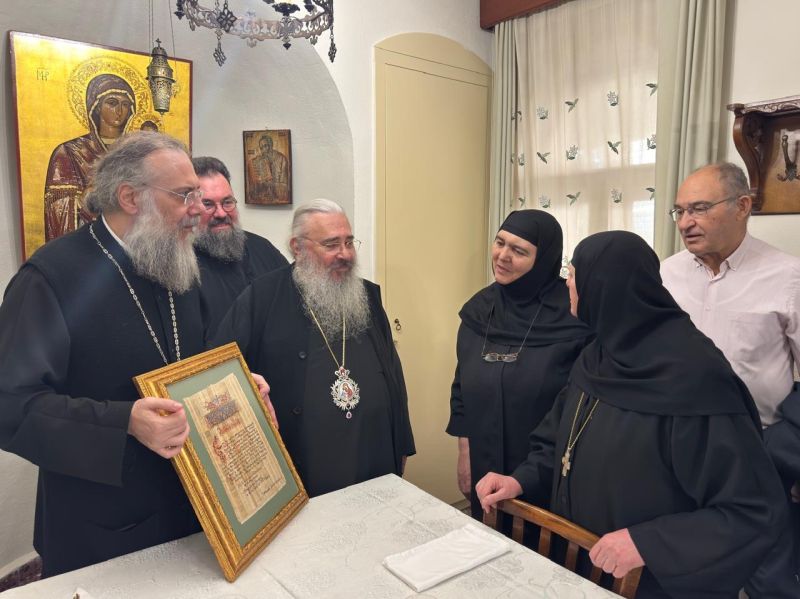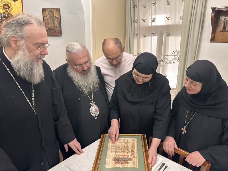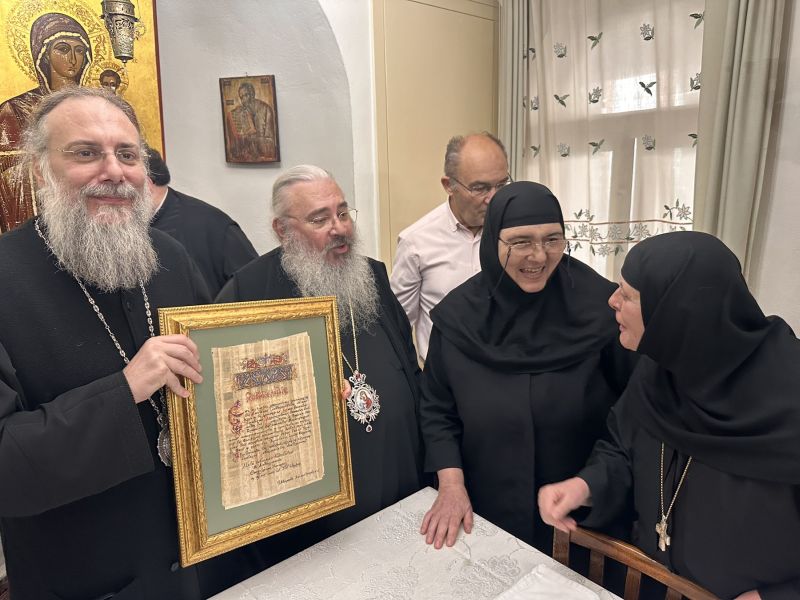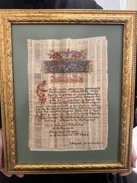 Η Γερόντισσα Θεοφυλάκτη προσέφερε στον Σεβασμιώτατο ένα κάδρο με ευχές γραμμένες σε πάπυρο.